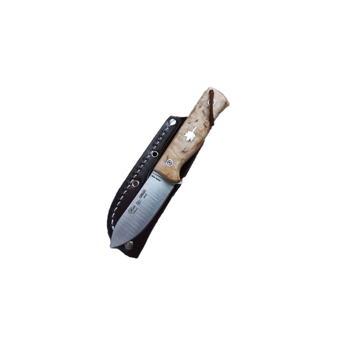 Exclusivo cuchillo de monte o machete Canuck Mini Nieto, hoja de acero sandvick 14c28n, amolado plano, todo una pieza enterizo, mango de abedul rizado, con una silueta de una hoja, con separadores rojos, remachado en acero, tamaño de hoja 8 cm, tamaño total 17 cm, ancho de pala 2,4 cm, grosor de hoja 2,7 mm, con funda de piel, también se puede portar en el cuello con el paracord.