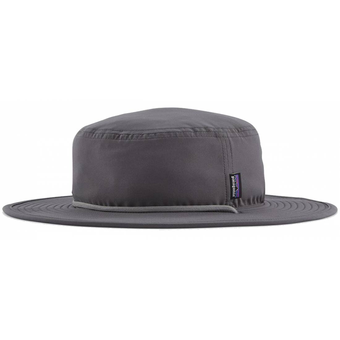 El tejido principal está hecho de ripstop elástico de poliéster 100 % reciclado tratado con acabado hidrófugo (DWR) fabricado sin PFAS añadidos de forma intencionada; la protección solar UPF 40+ y el ala ancha mantienen el sol a raya