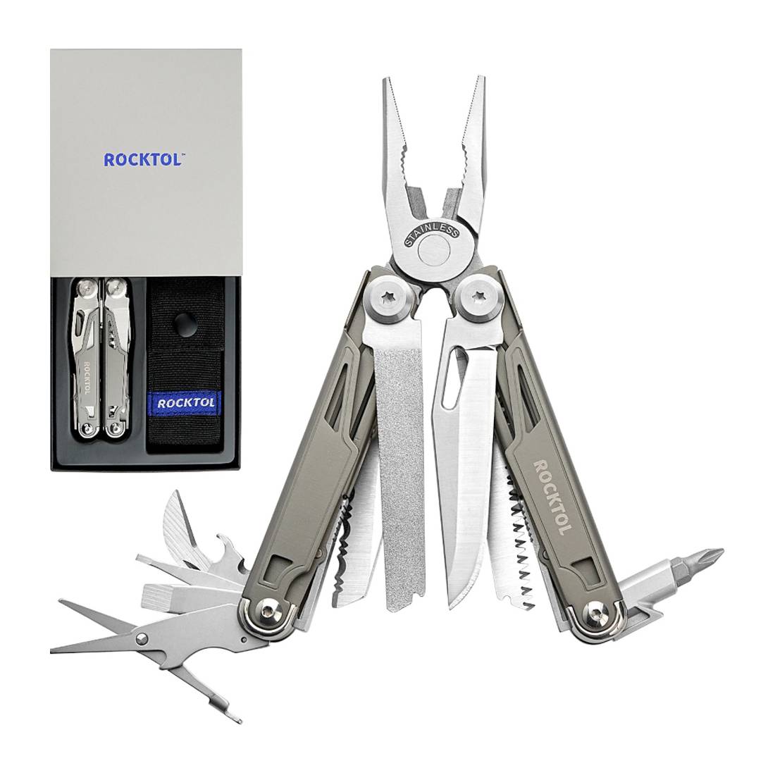 Presentamos La multiherramienta Rocktol 19 en 1 de alta calidad, con un mango Chapado en titanio y un cuchillo de acero inoxidable VG10 ultra afilado. Es perfecto para trabajos duros y aventuras al aire libre. Cada herramienta está equipada con un mecanismo de bloqueo de seguridad para mayor seguridad, y la construcción duradera de acero inoxidable garantiza que esté construida para durar. Además, el diseño compacto y ligero, junto con una funda de nailon resistente, hace que sea fácil de llevar con usted dondequiera que vaya. No se conforme con nada menos que fiable: ¡elija esta multiherramienta de primera categoría para sus tareas diarias o para su próxima aventura al aire libre!