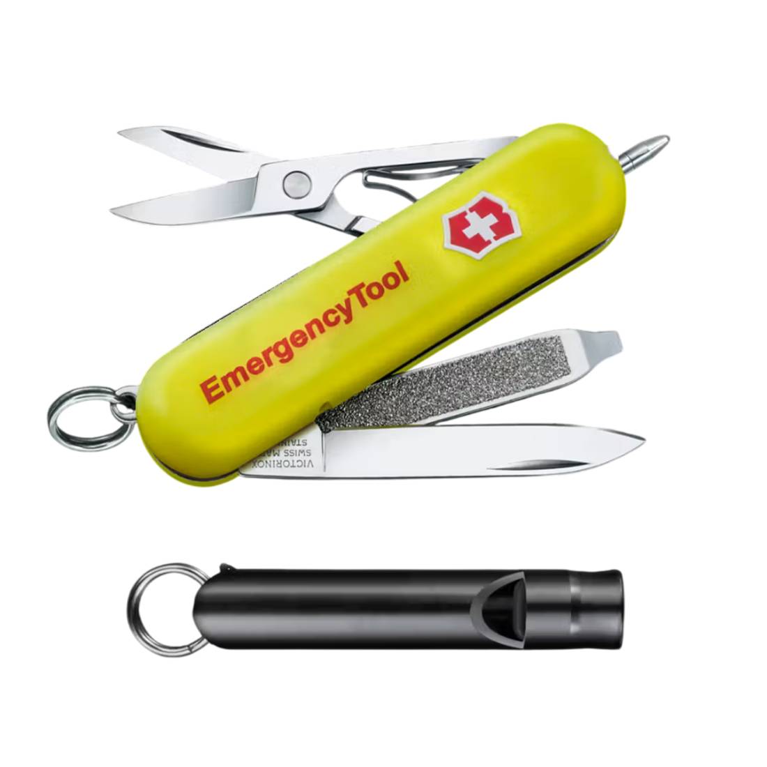 Para situaciones donde el suministro eléctrico es incierto, ya sea por fenómenos naturales o fallos de infraestructura, hemos desarrollado un modelo especializado basado en el Signature Lite, que incorpora una función de luz. Esta herramienta multifuncional, del tamaño de la palma de la mano, incluye un mango que brilla en la oscuridad para facilitar su visibilidad en condiciones de poca luz y un silbato para indicar su ubicación en caso de emergencia.