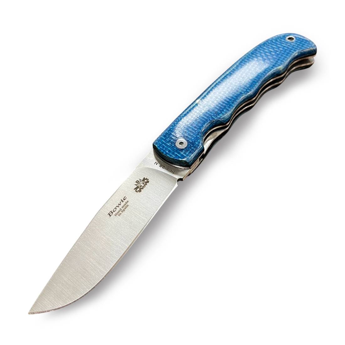 Navaja estilo Bowie artesanal de la marca CDS, hoja de acero 14C28N, mango de mikarta azul, tamaño de hoja 8,5 cm, tamaño total 19,5 cm.