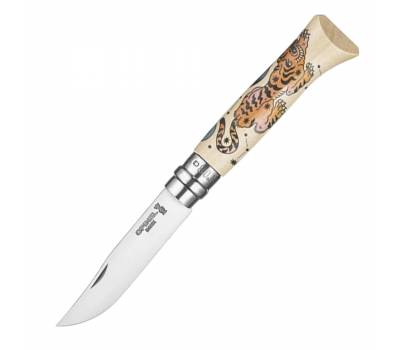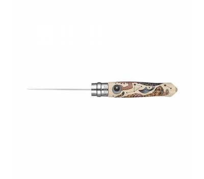 La navaja de bolsillo hecha en Francia tiene una hoja de acero inoxidable de 8,5 cm y un mango de carpe con certificado PEFC y decoración por sublimación. Viene acompañada de su caja y su tarjeta postal.