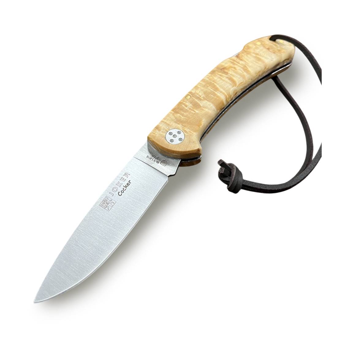 NB134 Navaja de caza de Joker línea Cocker, con denominación de origen ab, hoja de acero molibdeno vanadio, mango de madera de Abedul Rizado, tamaño de hoja de 9 cm.