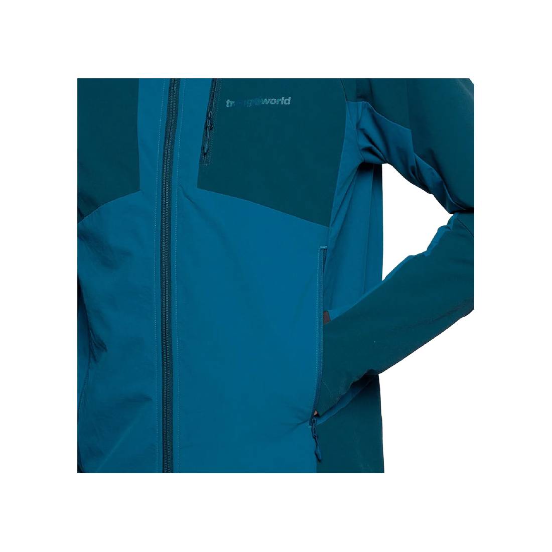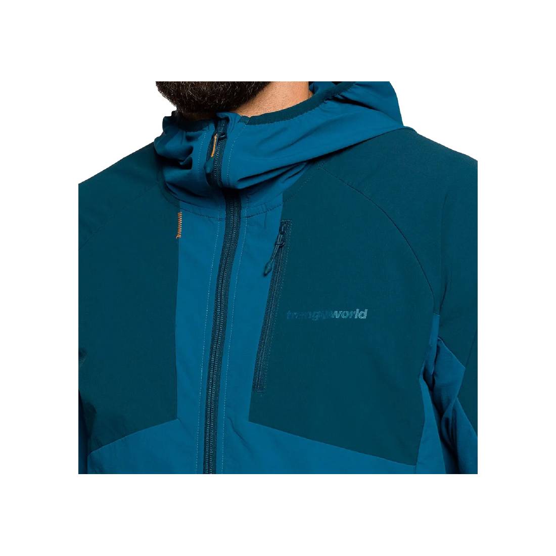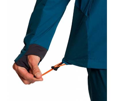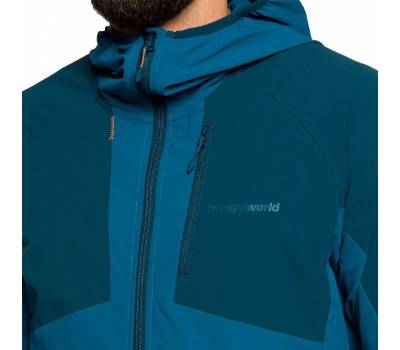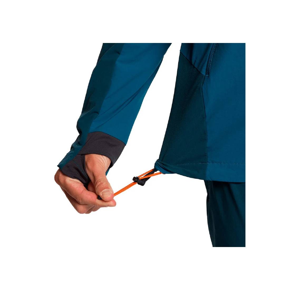 Chaqueta para alpinismo confeccionada con nylon reciclado elástico, destacada por su robustez. Cuenta con una capucha fija y contorno facial con cinta elástica. Las mangas son ranglán y tiene refuerzos en hombros, codos y cintura. La chaqueta incluye una cremallera longitudinal y un ceñidor con cordón elástico en el bajo, con cierre tanca. Los puños tienen ajuste elástico para el pulgar y la parte trasera es más larga para mayor protección. Dispone de un bolsillo pectoral con cremallera y bolsillos ventrales con cremallera. Además, tiene un tratamiento de repelencia al agua libre de PFC, es transpirable, ligera y confortable. El tejido bi-elástico proporciona confort y libertad de movimiento, con un ajuste corporal ergonómico.