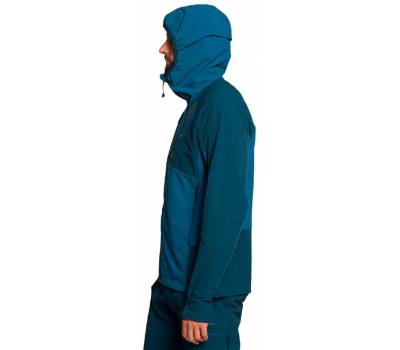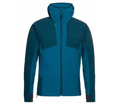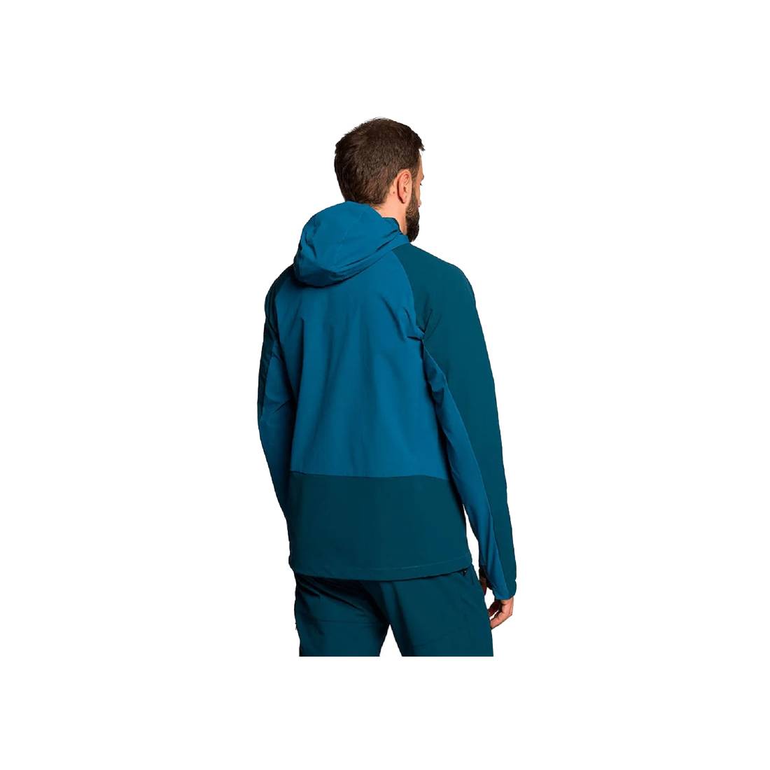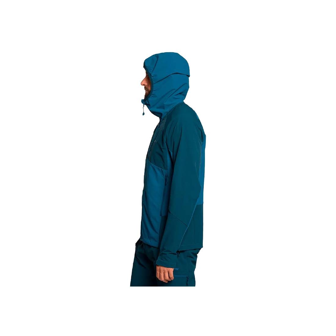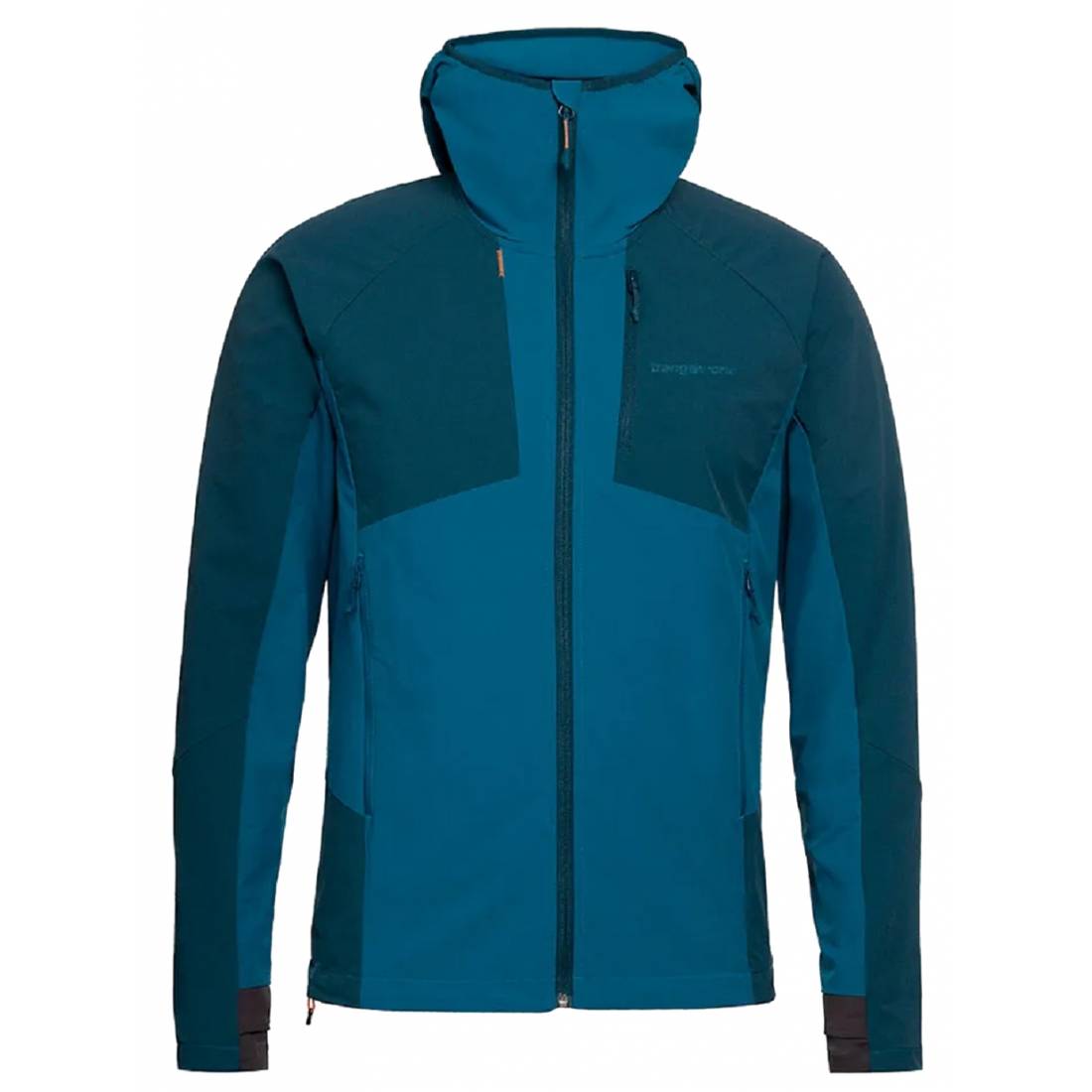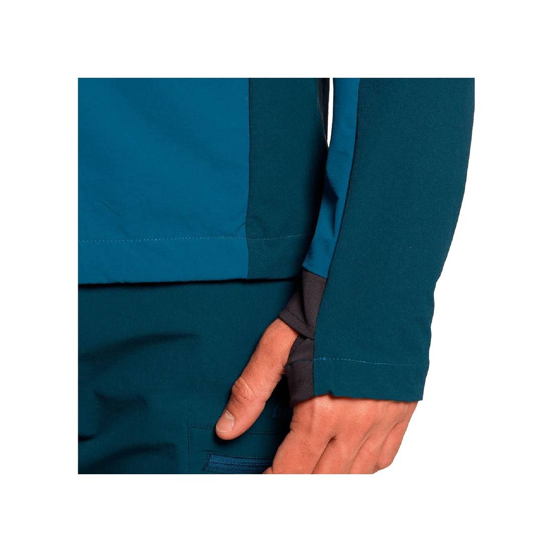 Chaqueta para alpinismo confeccionada con nylon reciclado elástico, destacada por su robustez. Cuenta con una capucha fija y contorno facial con cinta elástica. Las mangas son ranglán y tiene refuerzos en hombros, codos y cintura. La chaqueta incluye una cremallera longitudinal y un ceñidor con cordón elástico en el bajo, con cierre tanca. Los puños tienen ajuste elástico para el pulgar y la parte trasera es más larga para mayor protección. Dispone de un bolsillo pectoral con cremallera y bolsillos ventrales con cremallera. Además, tiene un tratamiento de repelencia al agua libre de PFC, es transpirable, ligera y confortable. El tejido bi-elástico proporciona confort y libertad de movimiento, con un ajuste corporal ergonómico.